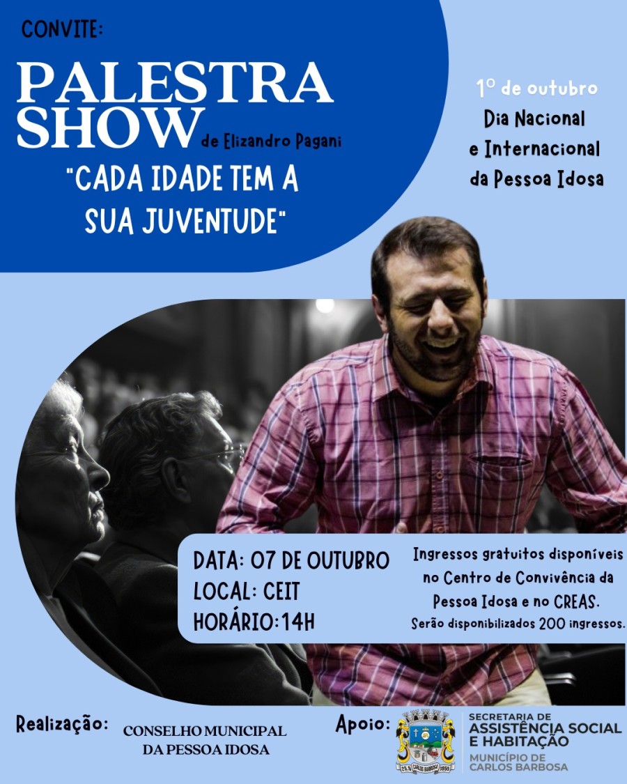 O Conselho Municipal da Pessoa Idosa, com apoio da Secretaria Municipal de Assistência Social e Habitação, realiza no dia 7 de outubro, às 14h, no Centro Educacional Ivo Tramontina (CEIT), a palestra show “Cada idade tem a sua juventude”, com Elizandro Pagani.